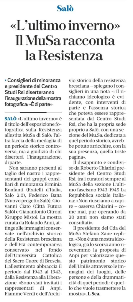 Ci sembra opportuno in occasione dell’inaugurazione della mostra del MuSa di Salò “L’ultimo inverno” far conoscere anche il contributo più rilevante che in passato – precisamente nel 2016 – abbiamo dato come Centro Studi Rsi alla storia della Resistenza, contributo che ebbe un apprezzamento sia sulla sulla stampa locale sia sul “Corriere della Sera” nazionale.