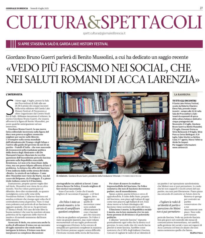 HomeConvegniL'intervista al nostro primo... Luglio 4, 2025 L’intervista al nostro primo relatore: lo storico Giordano Bruno Guerri By Redazione CentroRsi FacebookTwitterPinterestWhatsApp - Ente partecipato da - Più popolari L’inagurazione della nostra mostra alla NYU L’allestimento della nostra mostra “Dolomites Skirama. Lo stile della donna italiana in montagna 1922-1945” alla NYU “La Voce del Popolo” parla della nostra prossima mostra alla NYU! Il “Giornale di Brescia” e la nostra mostra alla NYU!