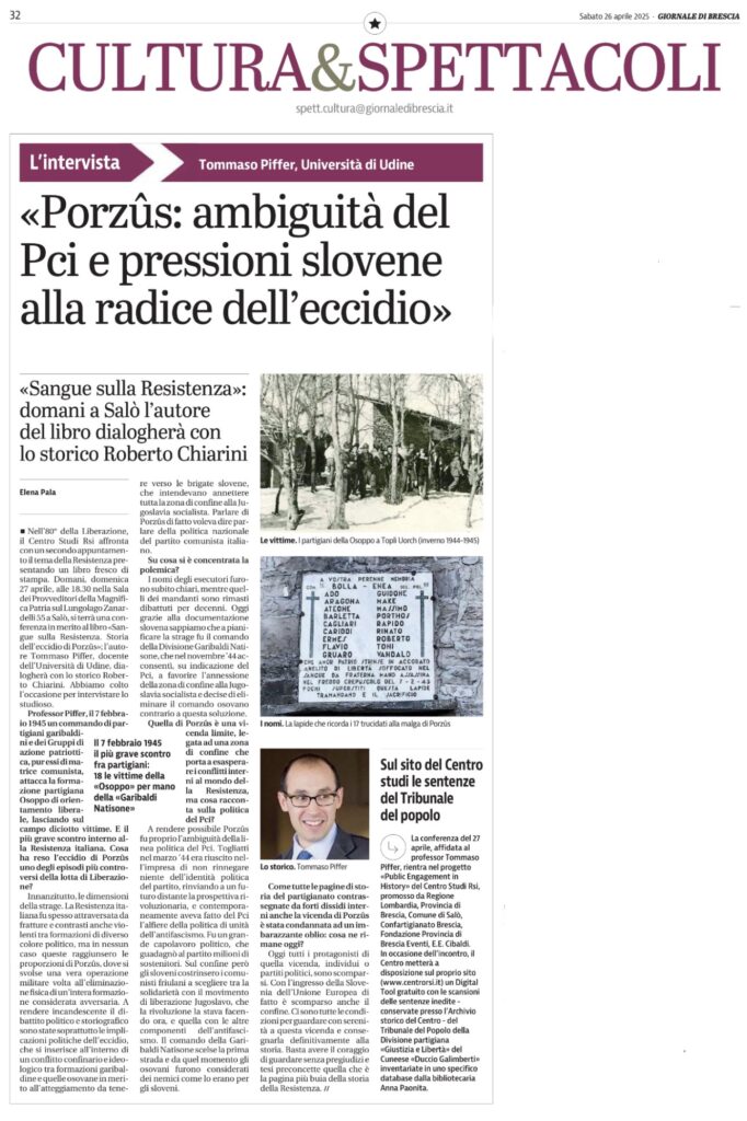 HomeBibliotecaUn'intervista allo storico Tommaso... Aprile 26, 2025 Un’intervista allo storico Tommaso Piffer By Redazione CentroRsi FacebookTwitterPinterestWhatsApp In vista della conferenza da noi organizzata per il 27 aprile abbiamo incontrato il nostro relatore d’eccezione: - Ente partecipato da - Più popolari L’inagurazione della nostra mostra alla NYU L’allestimento della nostra mostra “Dolomites Skirama. Lo stile della donna italiana in montagna 1922-1945” alla NYU “La Voce del Popolo” parla della nostra prossima mostra alla NYU! Il “Giornale di Brescia” e la nostra mostra alla NYU!